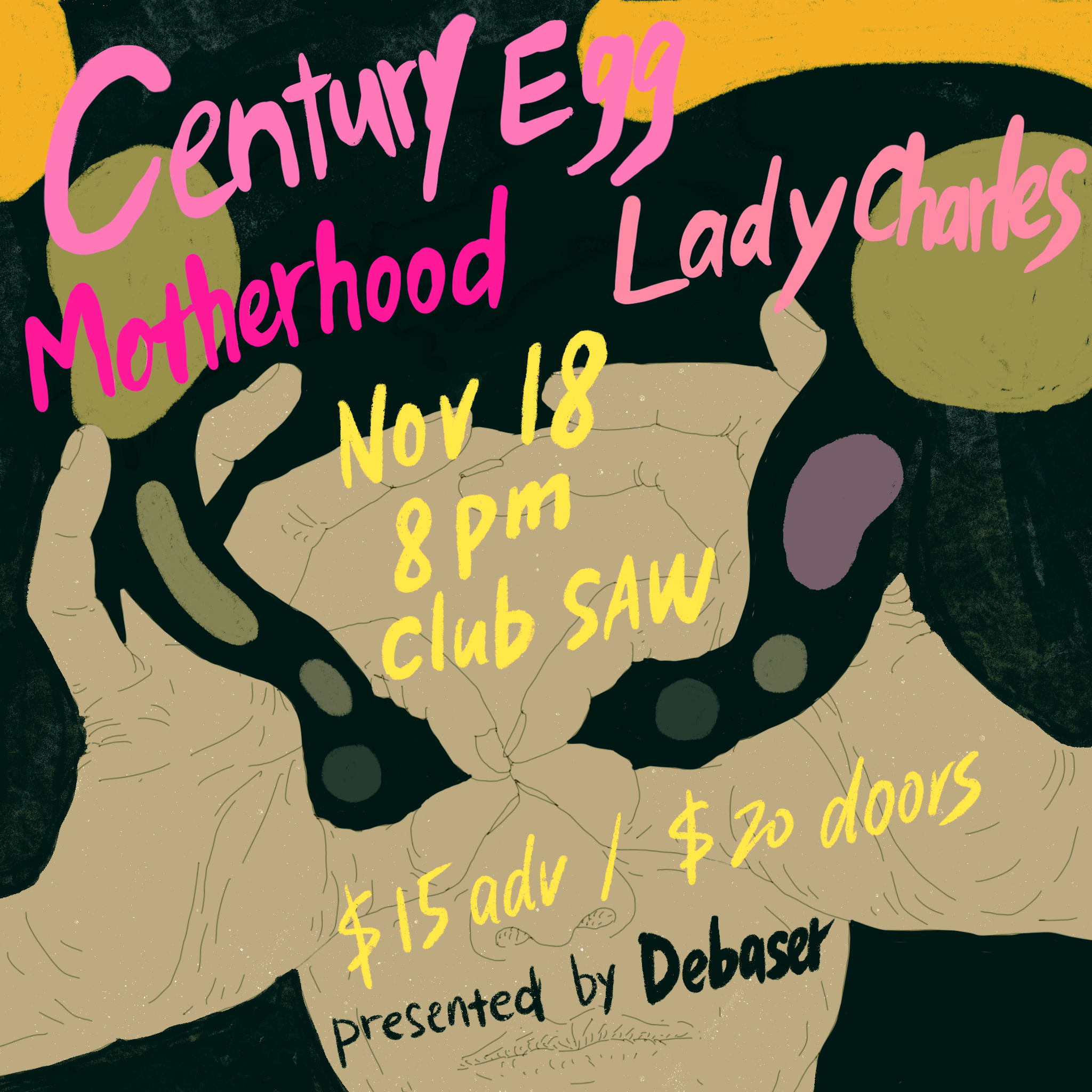 Upbeat rippers Century Egg (Hfx) and salty art punkers Motherhood (Frdtn) descend on Club SAW to perform with glam rock icon Lady Charles.
