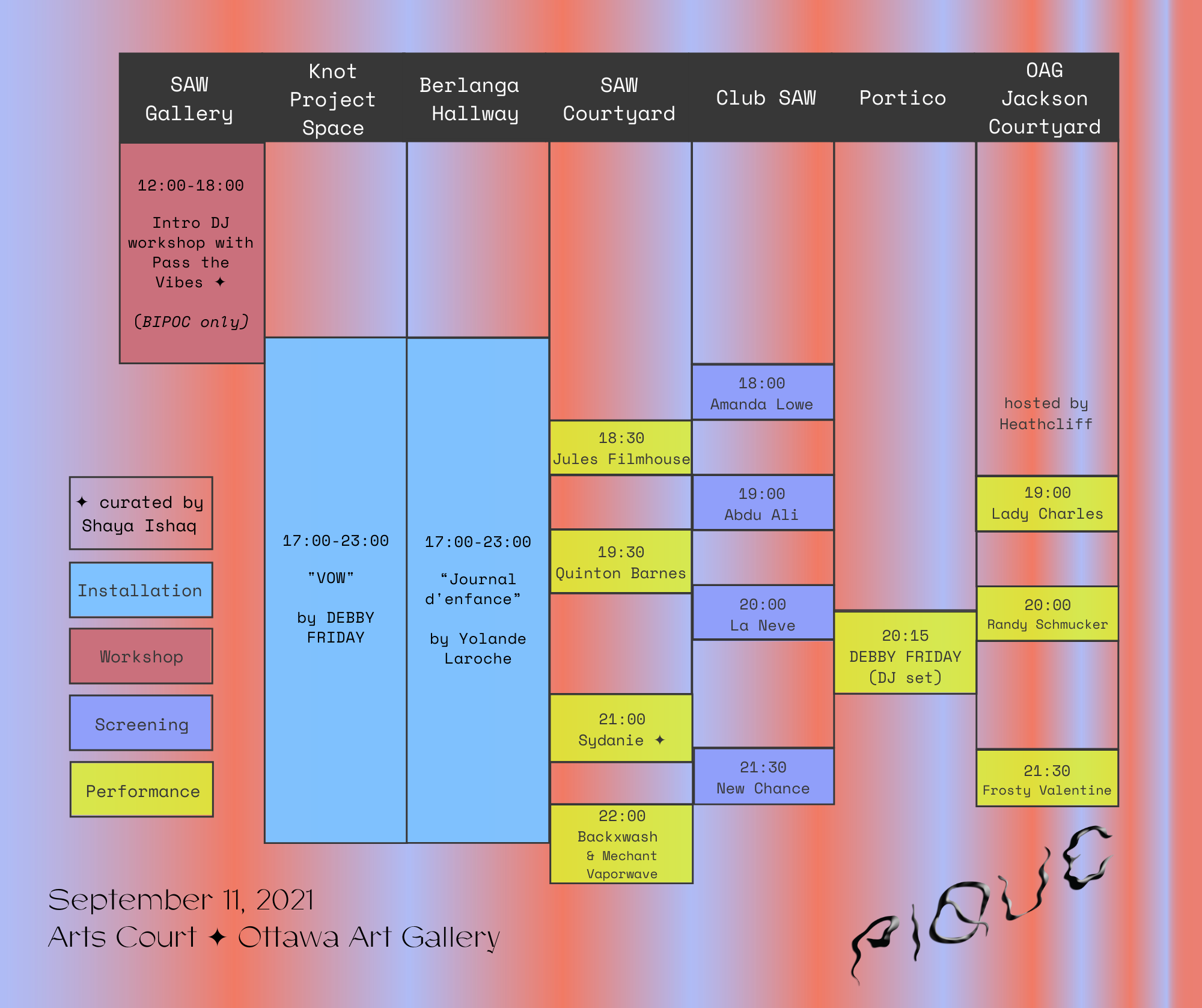 In-person programming will be happening in and around the Arts Court and Ottawa Art Gallery buildings, including the SAW Courtyard and OAG Jackson Terrace. Live performance spaces are accessible by ramp, and the indoor spaces are accessible by automated doors and elevator to all floors. We regret that the Portico performance area is not accessible to everyone. Wheelchair accessible, gender neutral washrooms are available throughout the building.