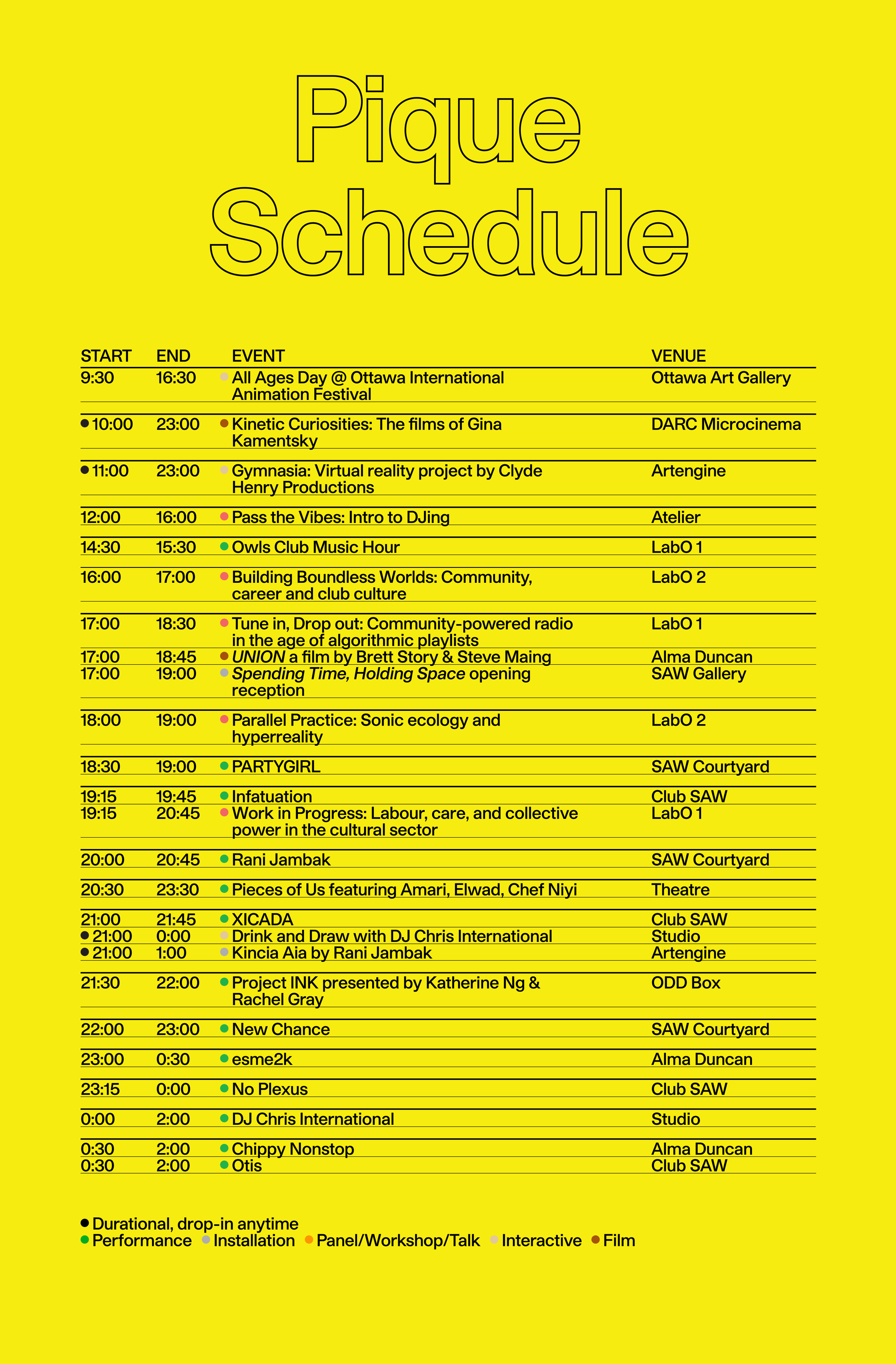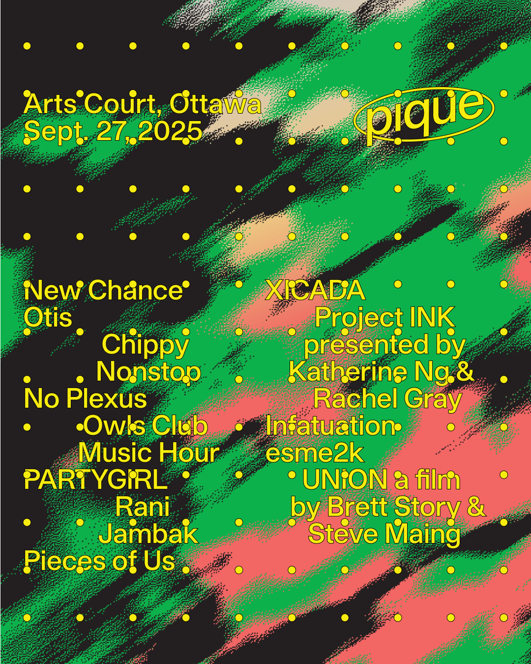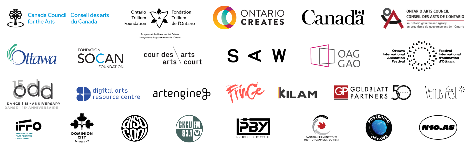 Thank you to our partners and sponsors! Pique is presented in partnership with the Arts Court, SAW, Ottawa Art Gallery, Ottawa International Animation Festival, Canadian Film Institute, Ottawa Dance Directive, International Film Festival of Ottawa, Ottawa Fringe, Digital Arts Resource Centre, Artengine, Produced by Youth, and Venus Fest and with support from Goldblatt Partners, Dominion City Brewing Company, Kilam Media, Postering Ottawa, Also Cool, CKCU FM, and n.10.as, and is funded by the Canada Council for the Arts, Ontario Trillium Foundation, Government of Canada, Ontario Creates, Ontario Arts Council, City of Ottawa, and the SOCAN Foundation.