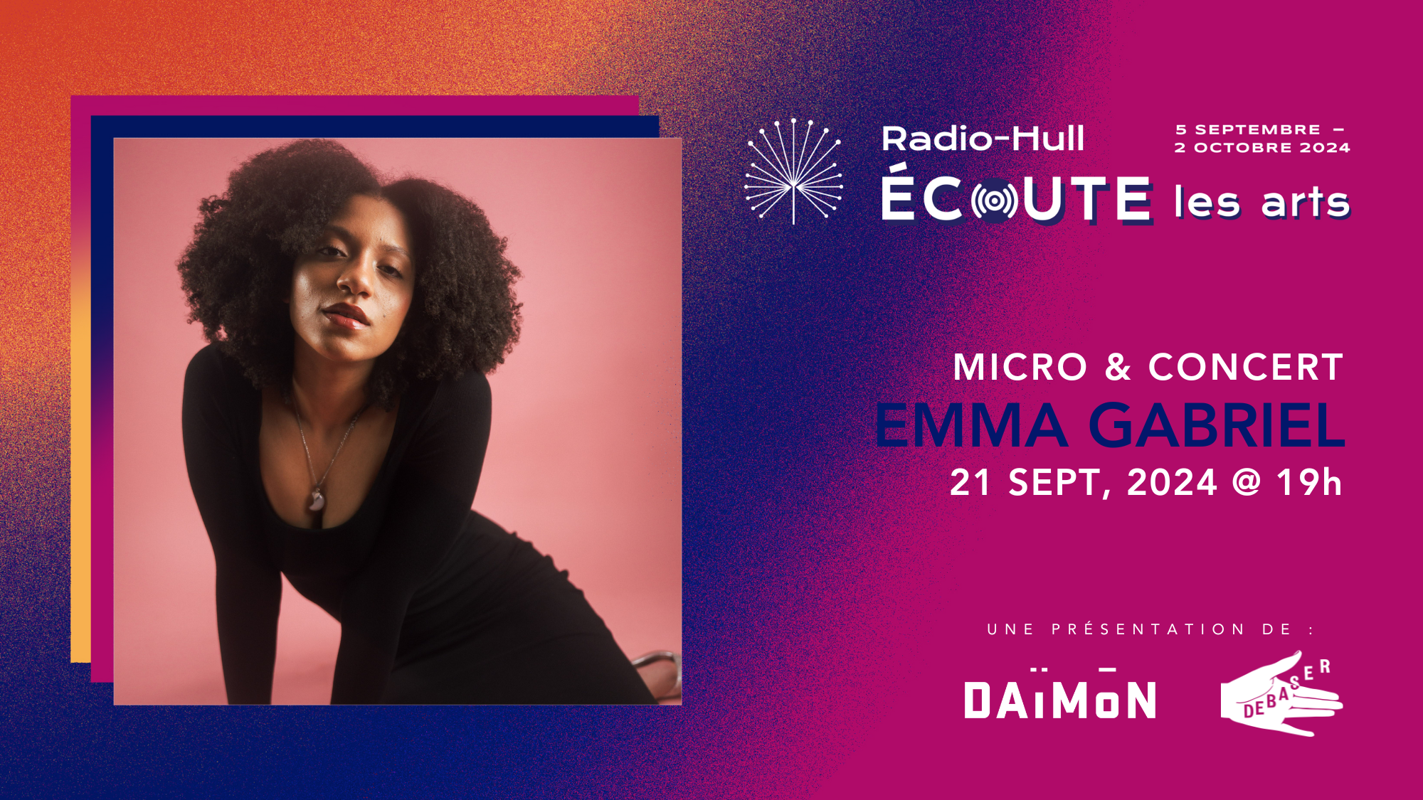 Radio Hull Micro & Concert: Emma Gabriel Saturday, September 21, 2024 7:45 PM 8:15 PM 19:45 20:15 Google Calendar ICS Live radio concert and interview featuring Emma Gabrielprogrammed by Debaser for Radio Hull Listen live