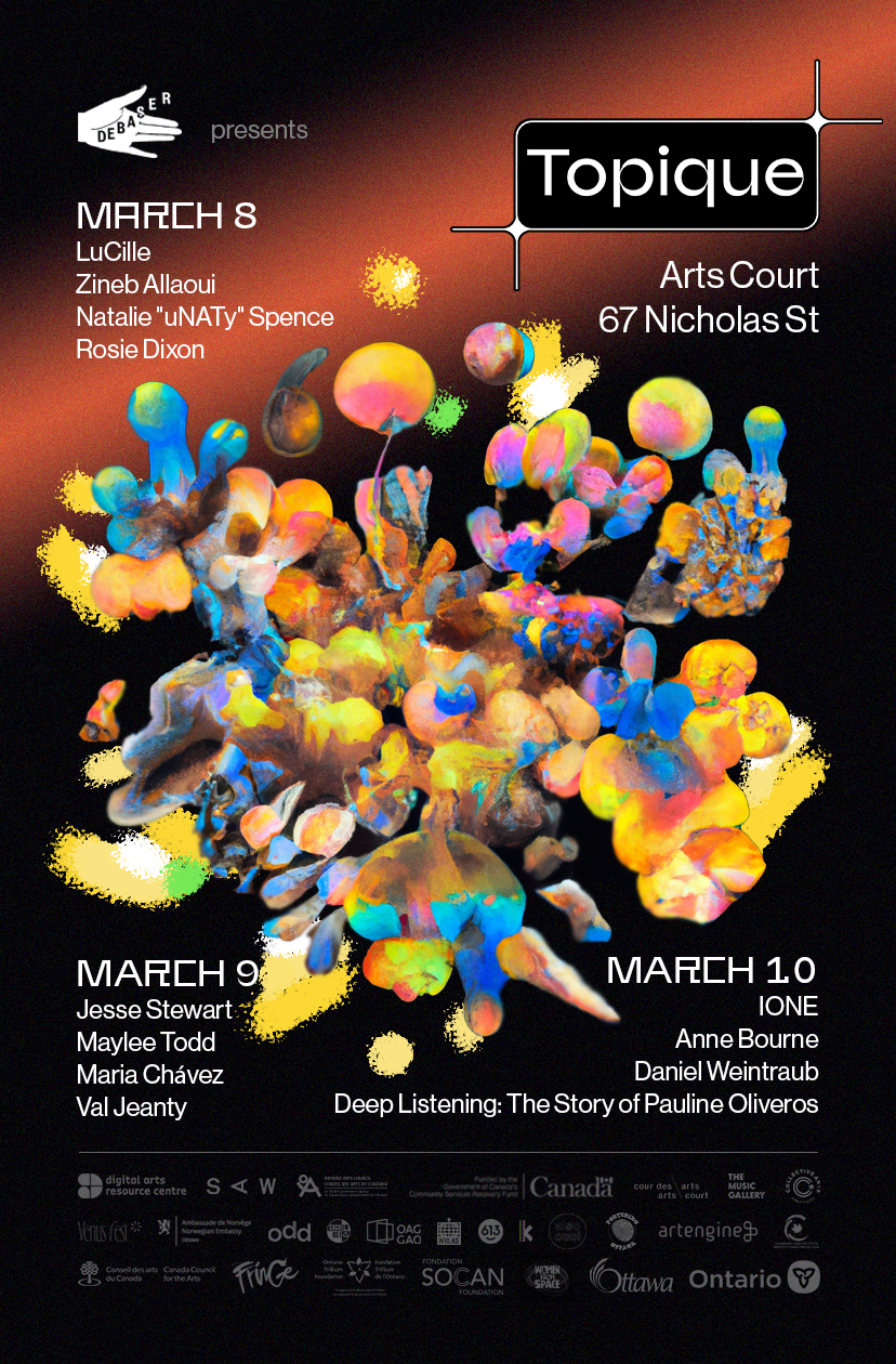 Topique, a forum for idea and knowledge exchange at Pique festival, returns this spring with three days of artist talks, workshops, and more. Taking place March 8-10, 2024 at the Arts Court around Pique festival programming, Topique invites attendees to dig deeper into the ideas and processes behind its artists’ groundbreaking work, exploring a range of topics including digital and analogue production techniques, mindful listening, womanhood and representation, and accessible improvisation.