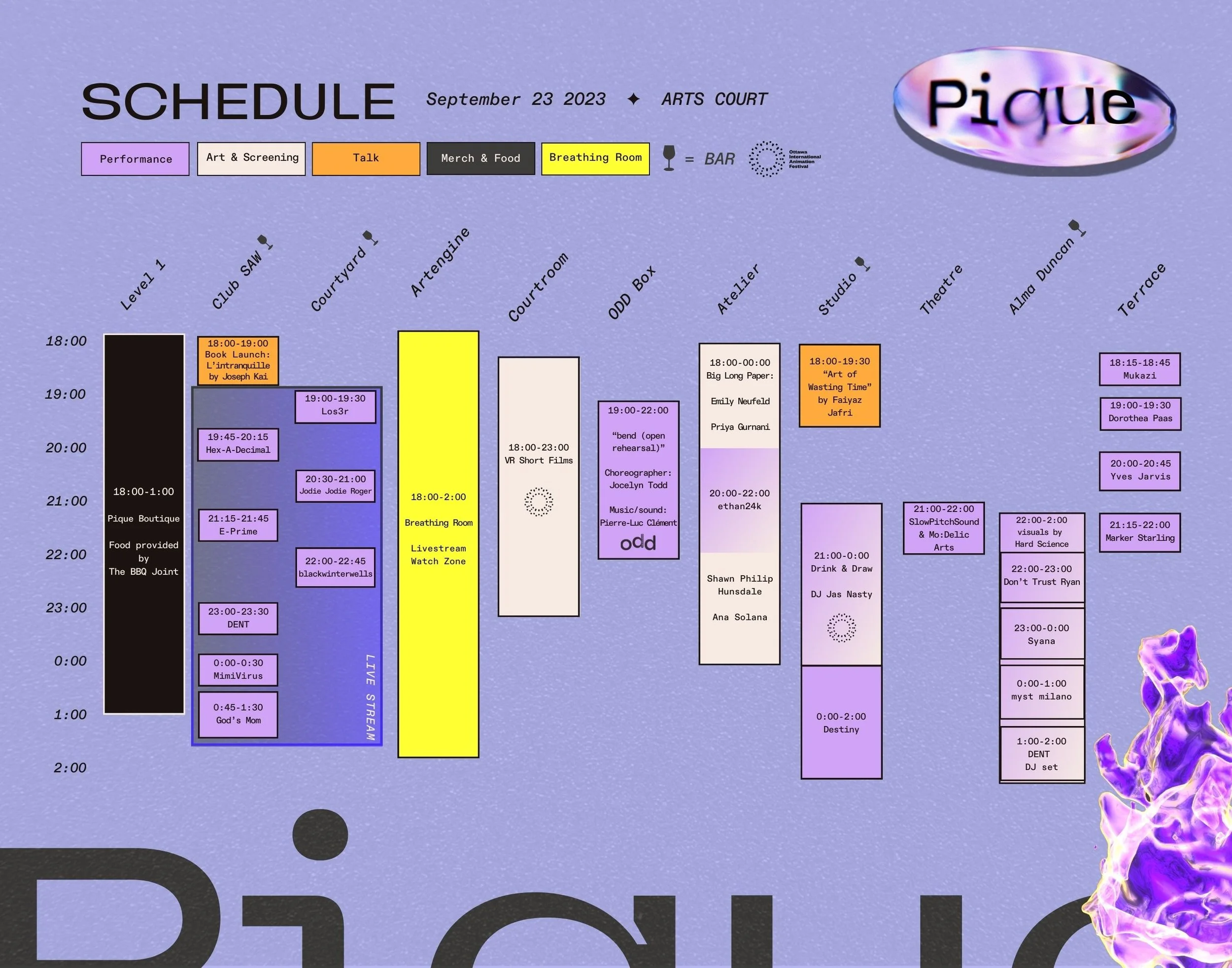 Pique fall edition features 25 artists across 7 stages and exhibition spaces, indoors and outdoors, all at the Arts Court building in downtown Ottawa. Programming takes place from 6:00 pm to 2:00 am, and individual showtimes are now available to consult on the schedule.