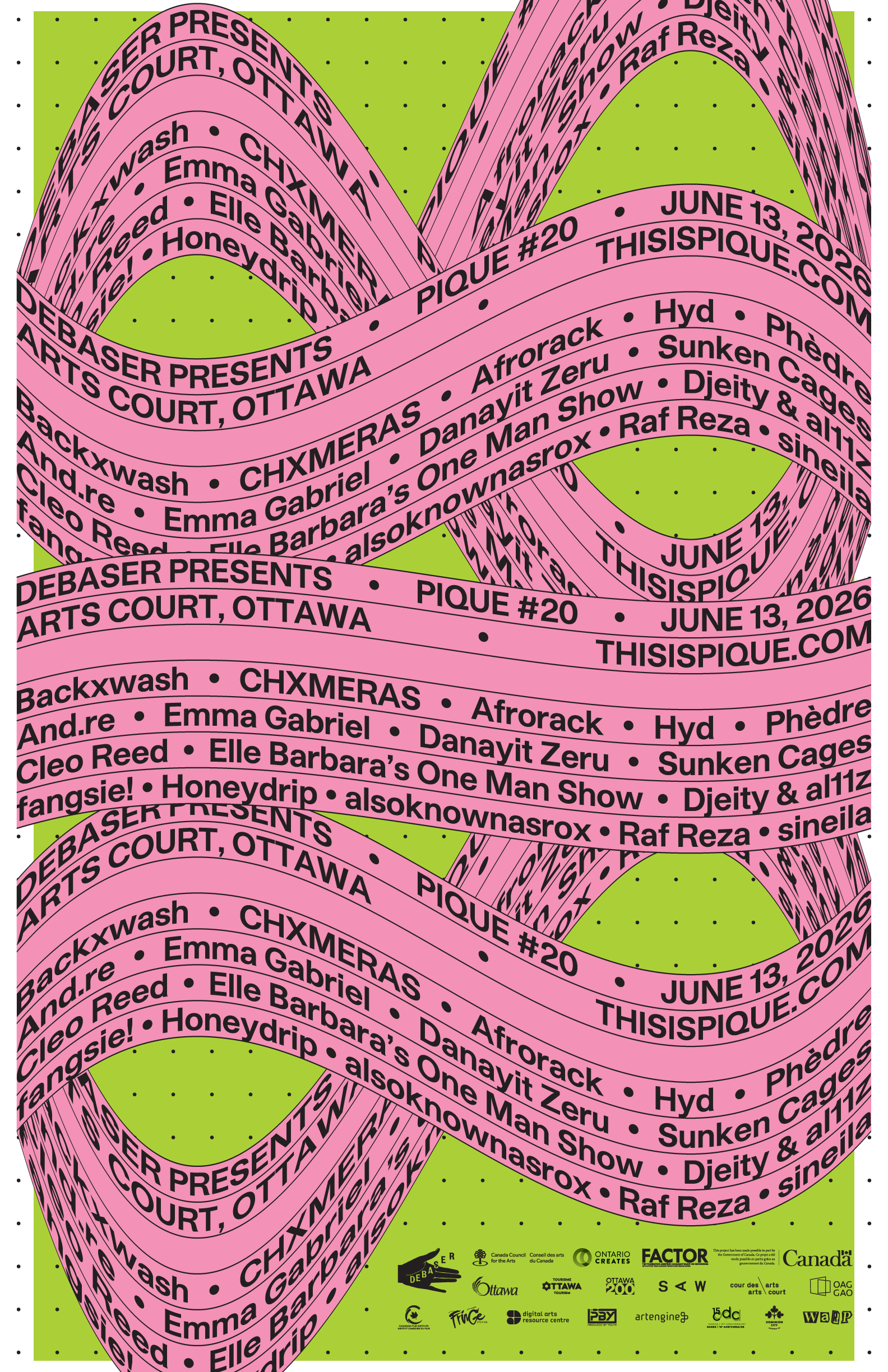 Pique is presented in partnership with the Arts Court, SAW, Ottawa Art Gallery, Canadian Film Institute, Ottawa Dance Directive, Ottawa Fringe, Digital Arts Resource Centre, Artengine, Produced by Youth, and with support from Dominion City Brewing Company and WARP, and is funded by the Canada Council for the Arts, Canadian Heritage, Government of Canada, Ontario Creates, FACTOR, City of Ottawa, and Ottawa Tourism.